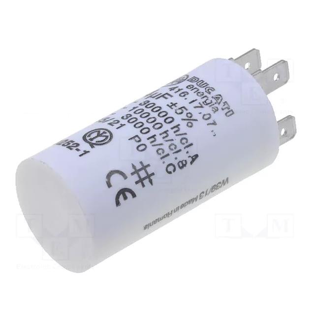 Motorkondensator / driftkondensator. Kan även användas som startkondensator så länge kapacitansen är korrekt.