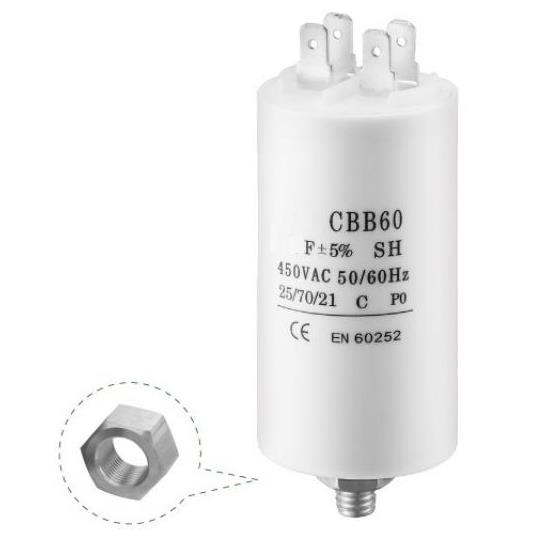 Motorkondensator / driftkondensator. Kan även användas som startkondensator så länge kapacitansen är korrekt.