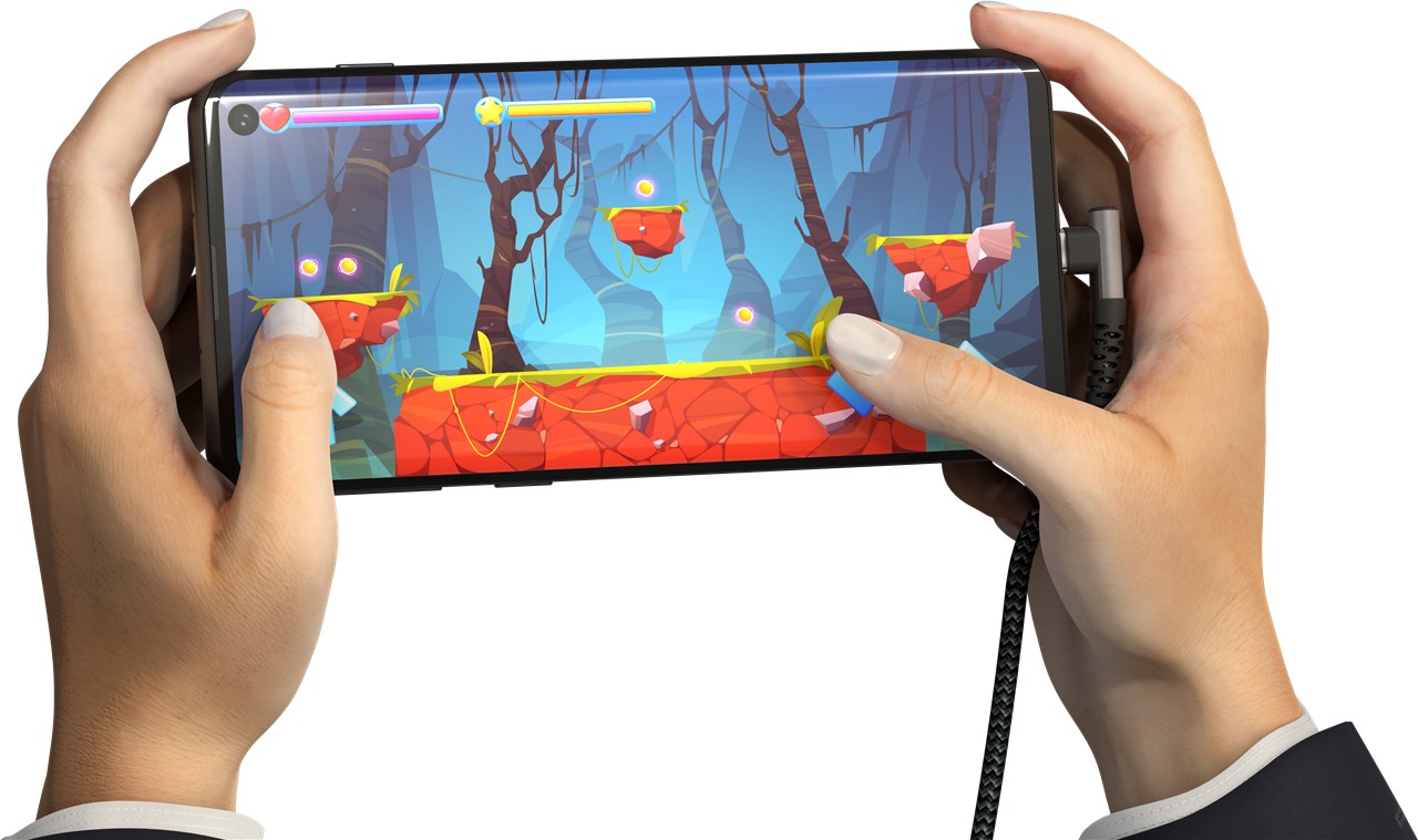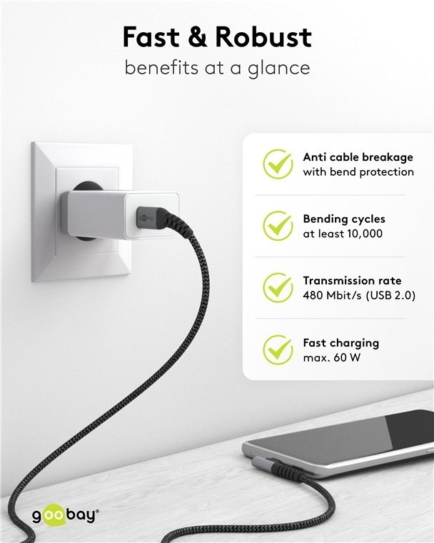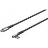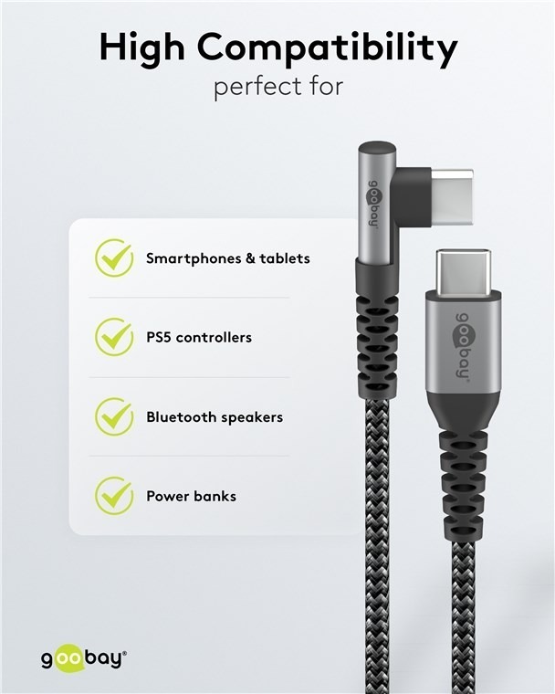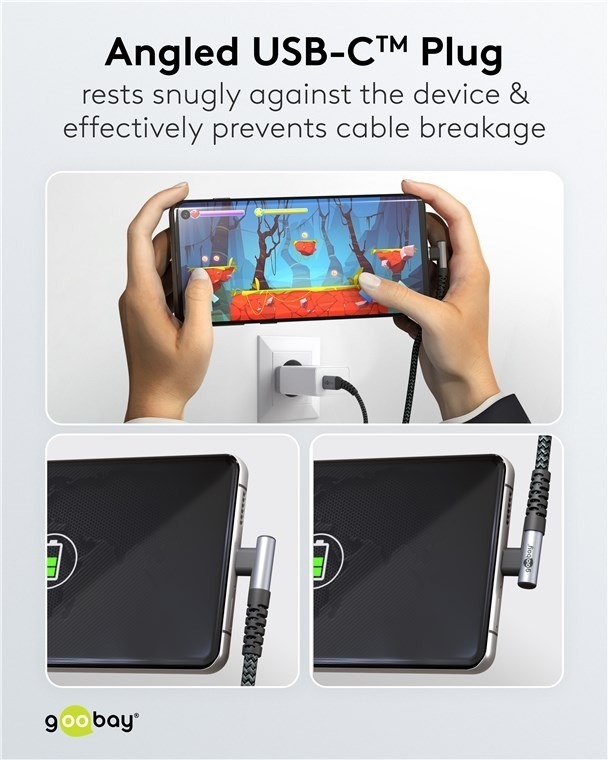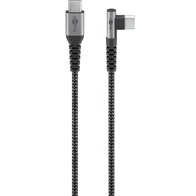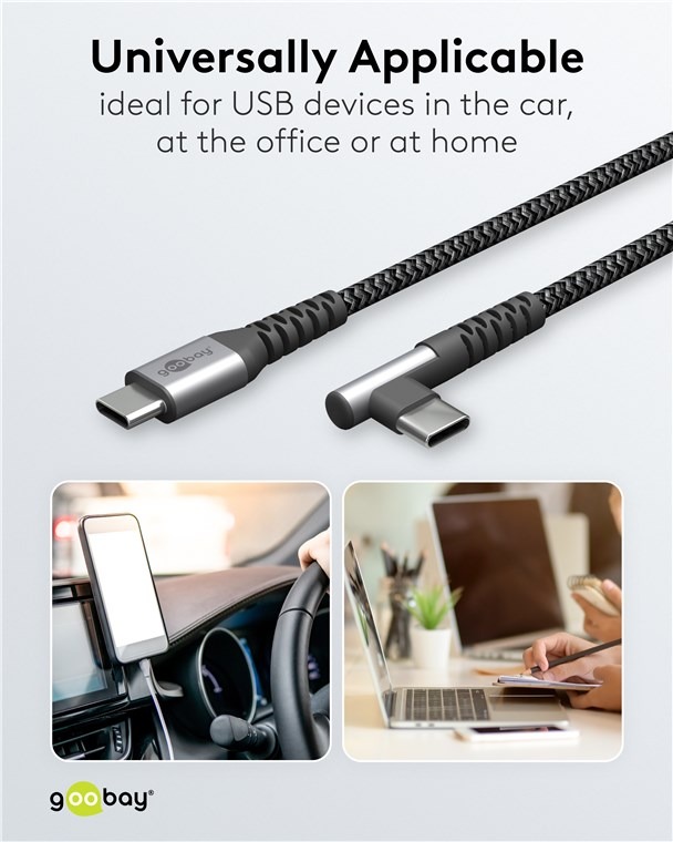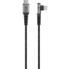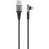 Tekstiltrukket USB C-C kabel med 90° plugg i den ene enden.