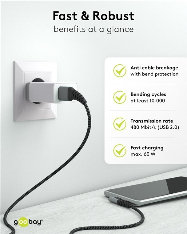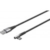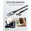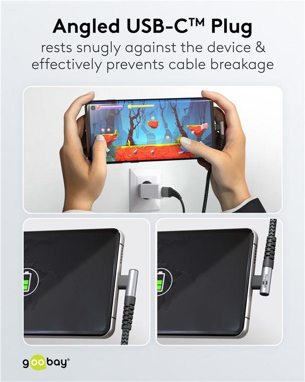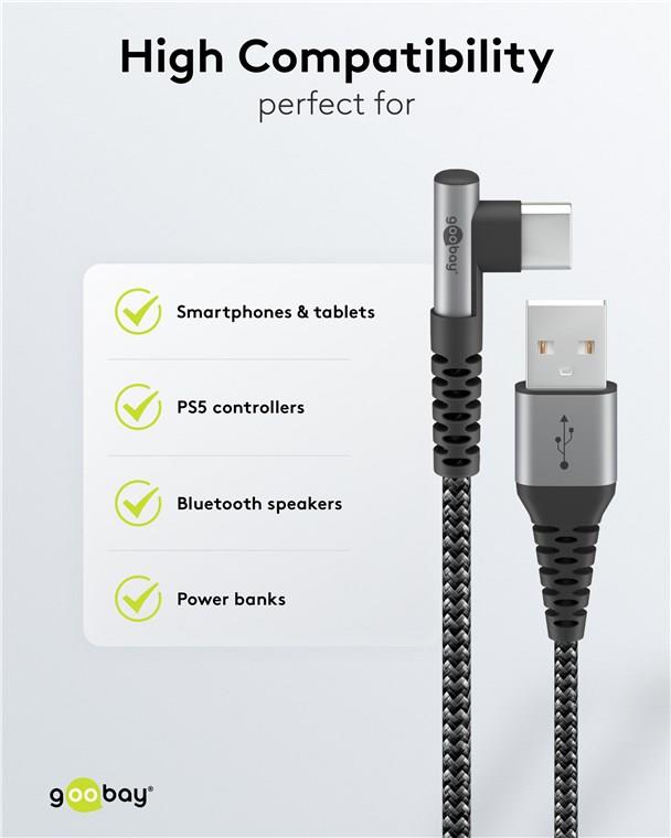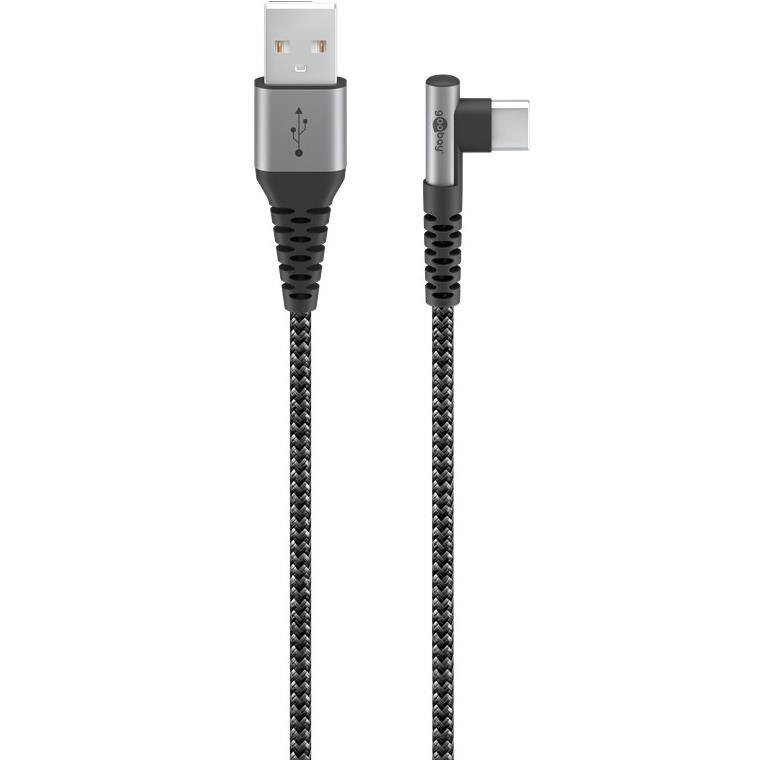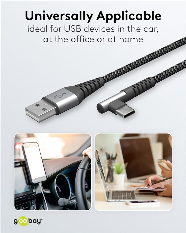 Tekstiltrukket USB A-C kabel med 90° plugg i den ene enden.