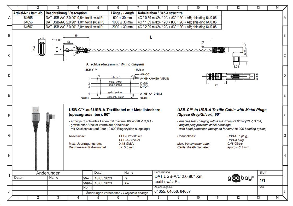 Kabel - USB A-C, 60W, 2m, vinklet, metallplugger - Bild 9