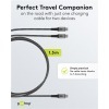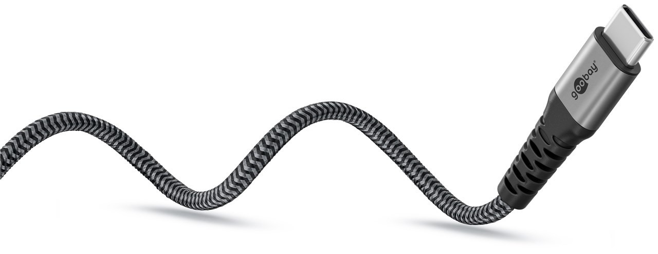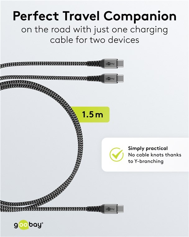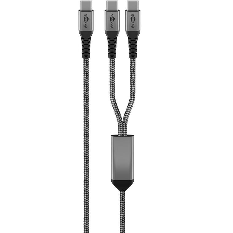 Tekstiltrukket USB C-C kabel, med 2 uttak i ene enden, for å lade 2 enheter samtidig.