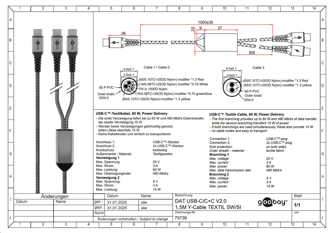 Kabel - USB C-2xC, 60W, 1.5m, metallplugger, 2-i-1 - Bild 13