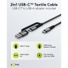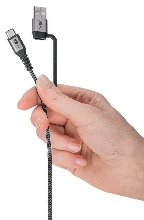 Tekstiltrukket USB A/C-C kabel, med adapter på ene siden.